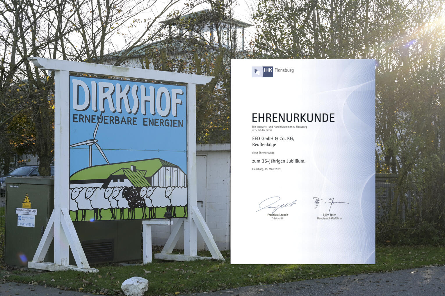 Die operative EED GmbH & Co. KG des Dirkshof ist seit 35 Jahren erfolgreich im Bereich Windenergie tätig und wurde für dieses Jubiläum von der der Industrie- und Handelskammer Flensburg ausgezeichnet.