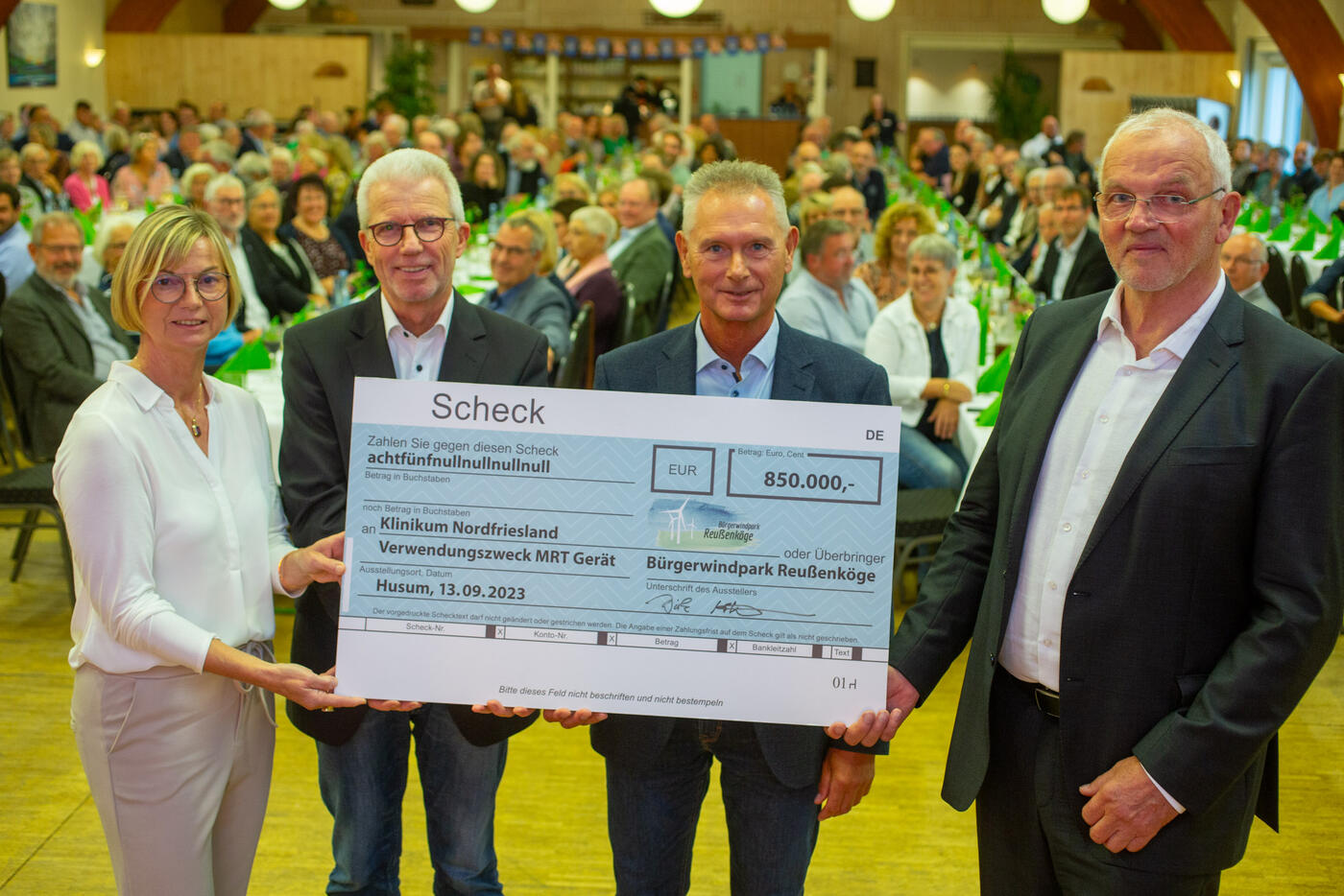 Getreu dem Motto, die Wertschöpfung in der Region zu lassen, haben die Geschäftsführer des Bürgerwindparks Reußenköge, Dirk Ketelsen und Anke Dethlefsen, dem Geschäftsführer des Klinikums Nordfriesland, Stephan Unger, einen Scheck in Höhe von 850.000,- Euro ausgestellt. Dieser dient der Anschaffung eines MRT-Geräts, das vom Klinikum dringend gebraucht wird. Schleswig Holsteins Ministerpräsident Daniel Günther wohnte der feierlichen Übergabe bei.